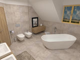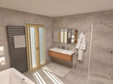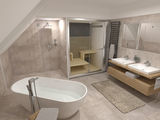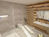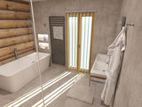 Koupelna v moderním srubu na Vysočině. Zvolen populární vzhled betonu ve větším formátu 120x60, díky kterému vzniká méně spár, a je tak koupelna lepší na údržbu.