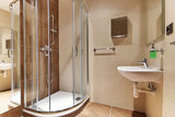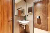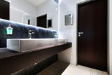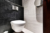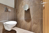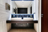 Pro tuto část budovy jsme hledali výjimečné výrobky, nic není ponecháno náhodě. Sanitární keramika Villeroy a Boch, baterie Hansgrohe, desky z kompozitního materiálu, vypadající jako dřevo ale 100 procentně odolné proti vodě, dlažba Porcelaingres doplněná černou dlažbou lafabbrica, která je inspirována lávovým kamenem a má neuvěřitelný povrch, s více jak 50 různými stupni přechodu z lesku do matu, z hladkého do strukturovaného povrchu, led podsvětlená zrcadla, to vše dohromady sladěno do jedinečného konceptu.