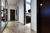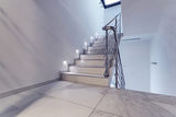 Do vstupu a schodiště jsme zvolili dlažbu formátu 150x75cm, která je díky digitální technologii tisku povrchu dlaždice a inspirací v přírodních vzorech krásnou, nadčasovou a od kamene téměř nerozeznatelnou variantou. Na rozdíl od kamene má dlažba ještě další výhodu, nenasákavost. Dlažba Porcelaingres velikosti 150x75cm je po položení monumentální, je to krásný formát a při použití v recepci nebo na schodišti, kde umožňuje řešit každý schod jedním kusem dlažby, je opravdu reprezentativním povrchem.