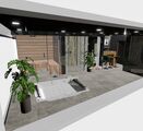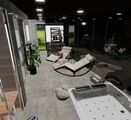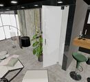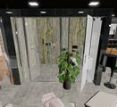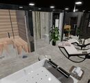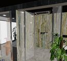 Na podlaze je použit formát 80x80cm z důvodu nepravidelného dispozičního řešení a také umístění podlahových liniových žlabů i v prostoru. Na zdech je použit formát 120x240cm na výšku, který čistě navazuje až k atypickému navrženému podhledu.