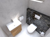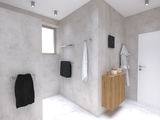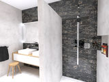 Koupelna v betonovém stylu, kterou obzvláštňuje hlavní stěna. Koupelnu doplňuje dřevěný nábytek.