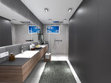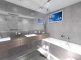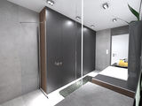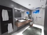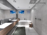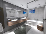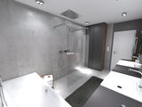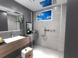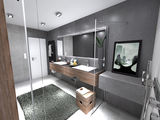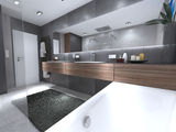 Moderní koupelna, kde byla zvolena populární kombinace obkladů a dlažby v imataci betonu v kombinaci se dřevem.