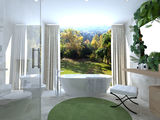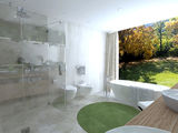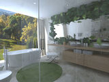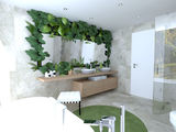 Koupelna s obklady v imitaci kamene v kombinaci s dlažbou v imitaci dřeva. Ozvláštněno netradiční tzv. zelenou stěnou za zrcadlem.