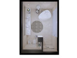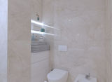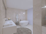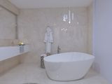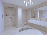 Moderní koupelna obohacena trendovým osvětlením s přizpůsobením stěn k podlaze. Moderní koupelny mají často na stěnách stejné dlaždice jako podlaha, které vytváří jednotný a čistý pocit tzv. luxusu.